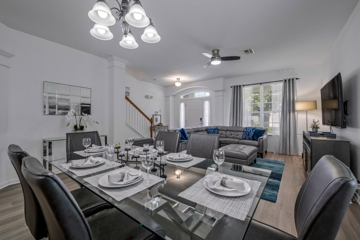 Come enjoy your dream vacation on this beautiful and stylish townhome near all Disney Parks. Designed to be your home away from home! Every detail was carefully thought to give you a 5 star experience! Guests can relax and recharge on a Tempur pedic California King bed for a holistic sleeping. Enjoy and relax at the clubhouse with a heated pool and other amenities. Our unique villa is the perfect spot for families who wants to enjoy the parks and the beautiful city of Orlando!