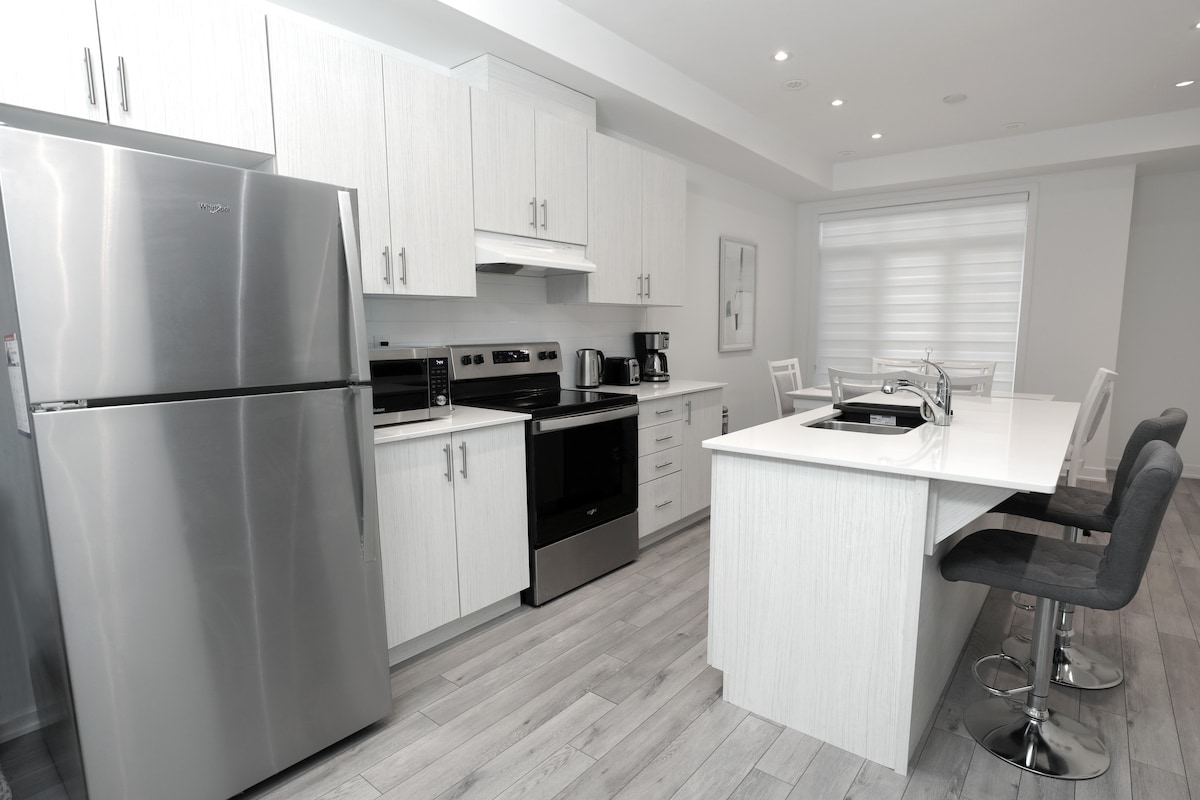 3 serene bedrooms with modern, calming decor and luxury furnishings Walking distance to Thermea Spa for ultimate relaxation and 15 mins drive to Toronto 2 free parking spots, one in driveway and one in garage (fits mid-sized SUV car or smaller) Fully equipped kitchen and smart appliances throughout the home 3 large smart TVs for premium entertainment Whiskey lounge for entertaining Outdoor ping pong table for added fun Peaceful private patio for coffee or wine High-speed Wi-Fi
