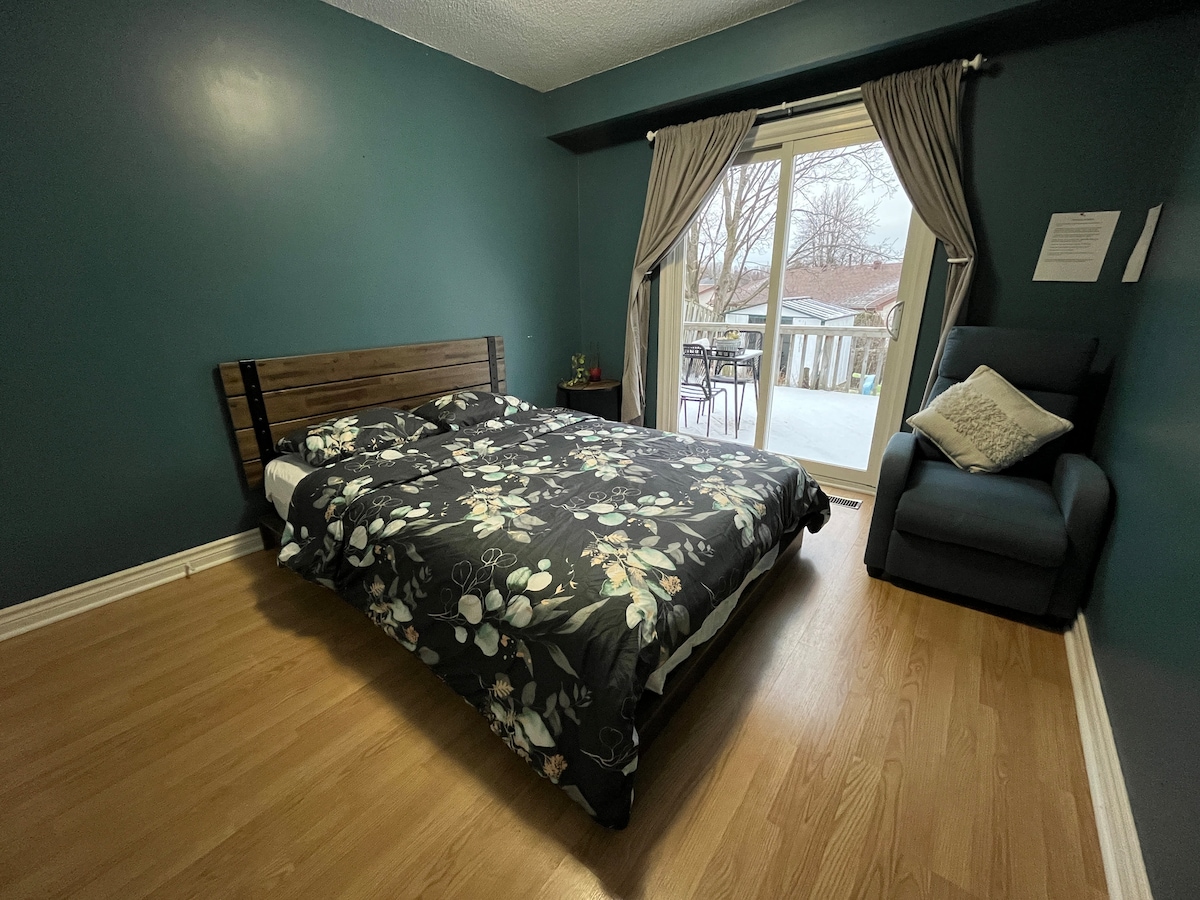 PRIVATE Walk Out Basement Apartment W/Separate Entrance. 420 Sq.Ft space. Queen Sized Bed. Oversized Shower w/ Rainfall Shower-head. Microwave, Two Mini Fridges, Coffee/Hot Water Tea Maker. Please note: not a full kitchen. Dining/Work Table w/Benches. High Speed Wi-fi. Living Room w/ Reclining Lazy Boy Couch and 50” Smart Tv. Over 1000 Live Tv Channels and Netflix. Private Little Backyard Patio w/Table. Private Driveway ( 2 Cars). 1 Min Drive to Hwy 401. 15 Min Walk to Ajax Go Station.