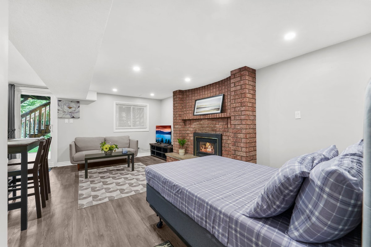 Legal Basement - This chic place comfortably accommodates up to 5 guests and comes fully furnished. There are 2 bedrooms, each accommodating 2 guests, along with a daybed in the living room for the 5th person. One bedroom offers a queen-size bed, while the other has a double-size bed. Also, there are 2 study tables with chairs, one in each bedroom and one in the living room. The meticulously designed kitchen boasts modern and luxurious touches. The stylish washroom features a standing shower.