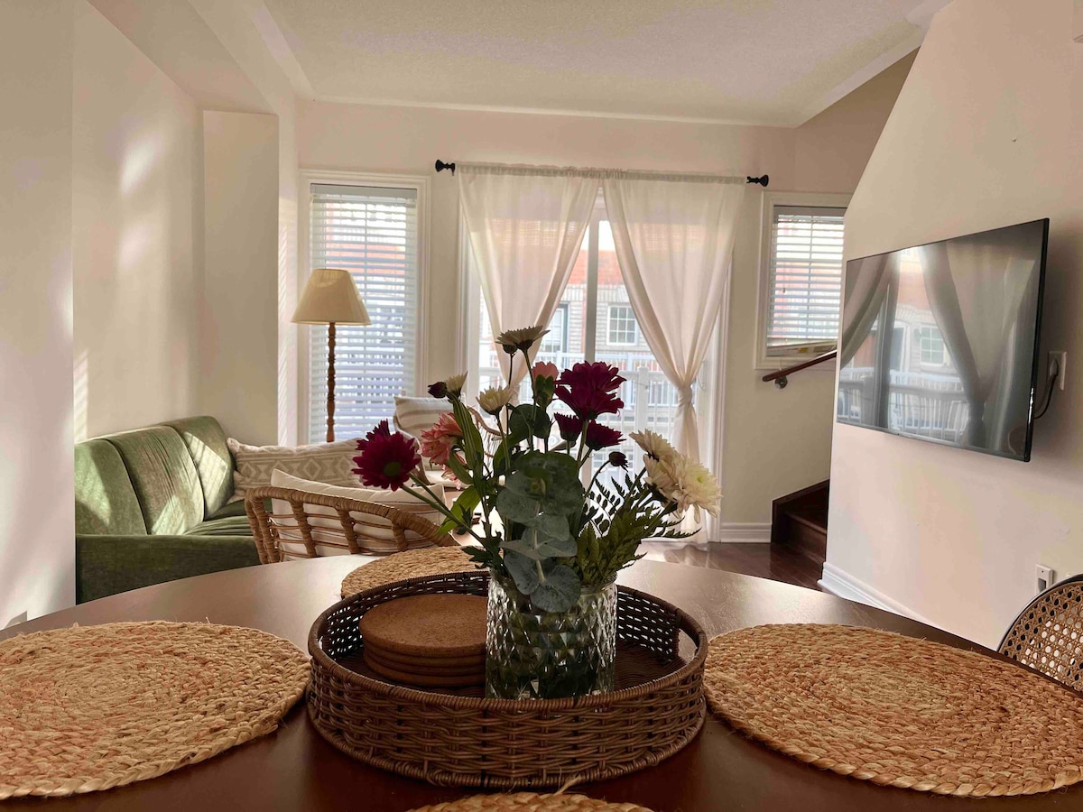 Kick back and relax in this calm and stylish space which is exceptionally adorned with amazing artwork throughout! This beautiful townhouse is located minutes to the 401 and 407 highways, the mall, waterfront trails, movie theatres and tons of restaurants! Whether looking for a family getaway or visiting from abroad, this is the perfect home for you with more than enough space to accommodate all your friends and family for a short or long term stay. Early check-in and late checkout!