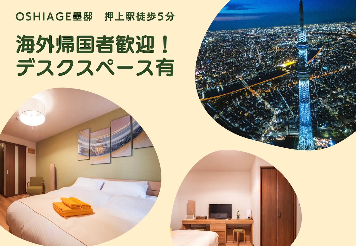 こちらは、日本一の高層建築であり東京を代表する観光名所「東京スカイツリー/押上駅」から徒歩わずか1分の場所に位置する、セルフチェックイン対応のホテルタイプのアパートメントです。 当施設は全8室の独立した客室をご用意しております(ファミリー向けトリプルルーム2室、ダブルベッドルーム5室、スタンダードツインルーム1室)。 どこか懐かしさを感じる昭和レトロな内装で、全室に専用バルコニーが付いております。 📍アクセス抜群: 【押上駅】【とうきょうスカイツリー駅】まで徒歩1分。 成田空港・羽田空港・新宿・渋谷・浅草・上野・銀座・秋葉原・日本橋・三越前・表参道・錦糸町・春日部・東京ディズニーリゾートなど、人気の観光地へ乗り換えなしでアクセス可能です。 🛒周辺環境充実: コンビニ、ドラッグストア、大型スーパー、多国籍グルメが楽しめるレストランなどが徒歩圏内に揃っています。 ❤️なお、当施設は繁華街に位置しているため、夜間に周囲の音が聞こえる場合がございます。音に敏感な方はご留意くださいませ。 もちろん、全室に快適な睡眠をサポートする耳栓をご用意しておりますので、どうぞご安心ください。