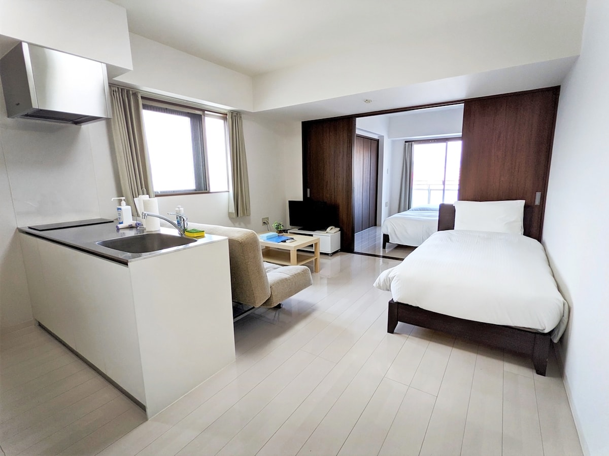 走进这间位于东京墨田区、晴空塔附近的一楼新公寓,浅木色的空间与柔和灯光交织,带来放松与温暖的居住体验。 房源布局 • 宽敞客厅 舒适沙发与电视,让旅途的片刻闲暇变得轻松愉快。 • 开放式厨房 配备基础厨具、餐具、电热水壶、冰箱、微波炉等家电,适合偶尔动手做一顿温馨的家常饭。 • 两间独立卧室 各配备 1.6m × 2.0m 的大双人床,柔软舒适,布置清新现代,让人一进门就倍感放松。 • 卫浴设备 • 干湿分离设计,保持空间整洁清爽。 • 设有浴缸与独立淋浴间,可在旅途中舒缓身心。 • 双洗面台设计,让早晚梳洗更高效。 • 配备一次性牙刷、吹风机等基础洗漱用品。 • 洗衣机带烘干功能,出差或长住也能轻松应对洗衣需求。 舒适便利的地理位置 • 步行范围内有便利店、超市、咖啡厅、地道日式餐厅。 • 步行约3分钟即可到达东京晴空塔与晴空塔城购物中心 • 交通便利,可轻松前往浅草、上野、秋叶原等热门区域 房源特色 • 全新装修,温馨明亮 • 双卧设计,适合家庭、情侣或朋友同行 • 一楼户型,无需爬楼,出入方便 • 免费寄存行李室