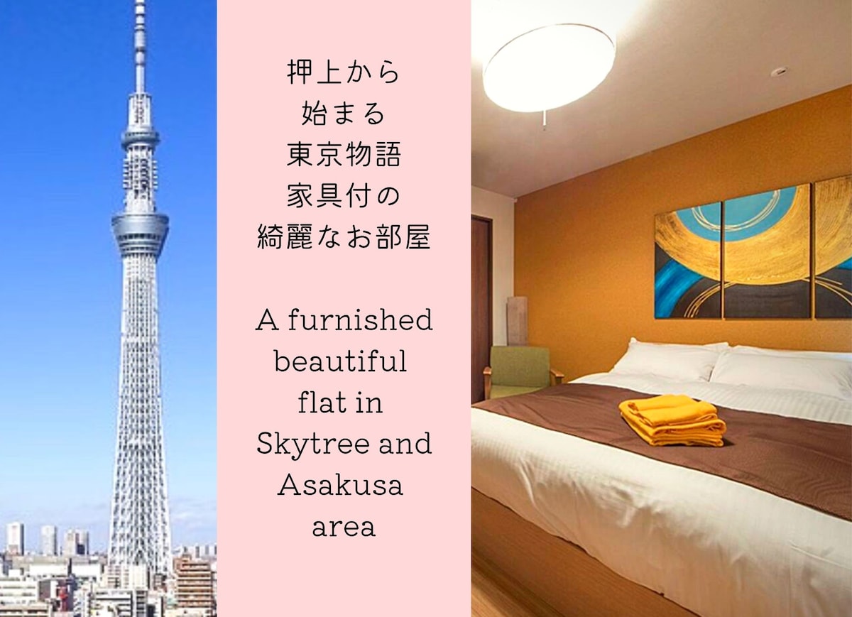 603 房间。押上站6分钟,近晴空塔,直达浅草、上野、银座、涩谷、机场。最多3人。行李寄存。