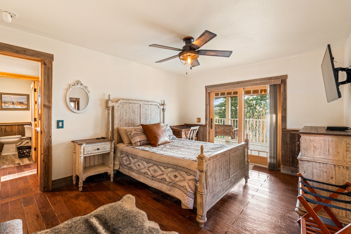 The "Honeymoon" suite is dedicated to Jim's parents who were married for almost 60 years and were very supportive of our Bed & Breakfast dream. The grandest and most romantic suite (over 1/3 of the 2nd floor), boasts the largest bedroom, with adjoined sitting/reading room, walk-in closet, and a private balcony overlooking Beaver Dam Lake. The beautiful bathroom*, with his/hers rainfall showers and vessel sink, rivals those found in 5-star hotels. The relaxing blue hue of the bedroom changes color as the sun goes from East to West, and the luxurious bed boasts a comfortable queen-sized mattress on a wrought-iron sleigh bed. All this paired with a 5-star comforter will give you the most relaxing sleep you've had in ages. Let your feet sink into the thick Persian rugs that complete the room. Start your day with an early morning cup of coffee, or have your breakfast brought up to you on the private balcony. Finish your day with an intimate glass of wine as you watch the sunset, and later watch as thousands of fireflies adorn the landscape most summer nights. *If the Floyd & Dorothy Suite is the first room reserved for the night, the Miss Katie Suite and Miss Paris Suite are taken offline, giving you a private en suite bath and an exclusive stay with us. If one of the other rooms is already reserved, the bath becomes shared.