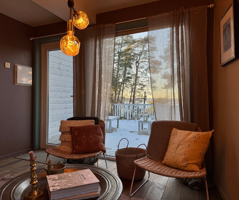 🏡 70 m² cabin by beautiful lake with stunning seaview for max 6 guests 45 minutes from Oslo by car/bus Available all year, great for activities & fishing Beach & playground 2 bedrooms + loft = 3 double beds Big terrace with gas barbeque Jacuzzi with 38° all year, included Free car parking nearby Charging (extra) Electric boat (extra) Air condition & heating Wi-fi Sound system Big projector with streaming services Fully equipped kitchen Washing machine / tumble dryer Bed sheets, linens & towels