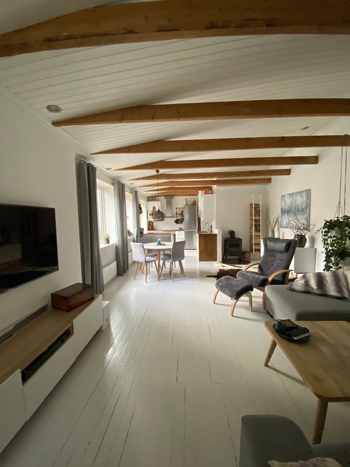 Big, spacious loft apartment. Undisturbed. 5 meters to ceiling. Big living room, separate eating area. 1 big bed room with double bed and a fold out couch for 2 pax . 1 bed room with bunker beds for 2 pax. Separate area on level 2 with double bed. Balcony with seating. Great view. Very central location with 4 bus lines outside. Main Bus hub 1 stop away. Main train station (Oslo S) 2 stops away. Free garage (must be booked). Private condos only. Quiet entry and exit please, respect neighbors.