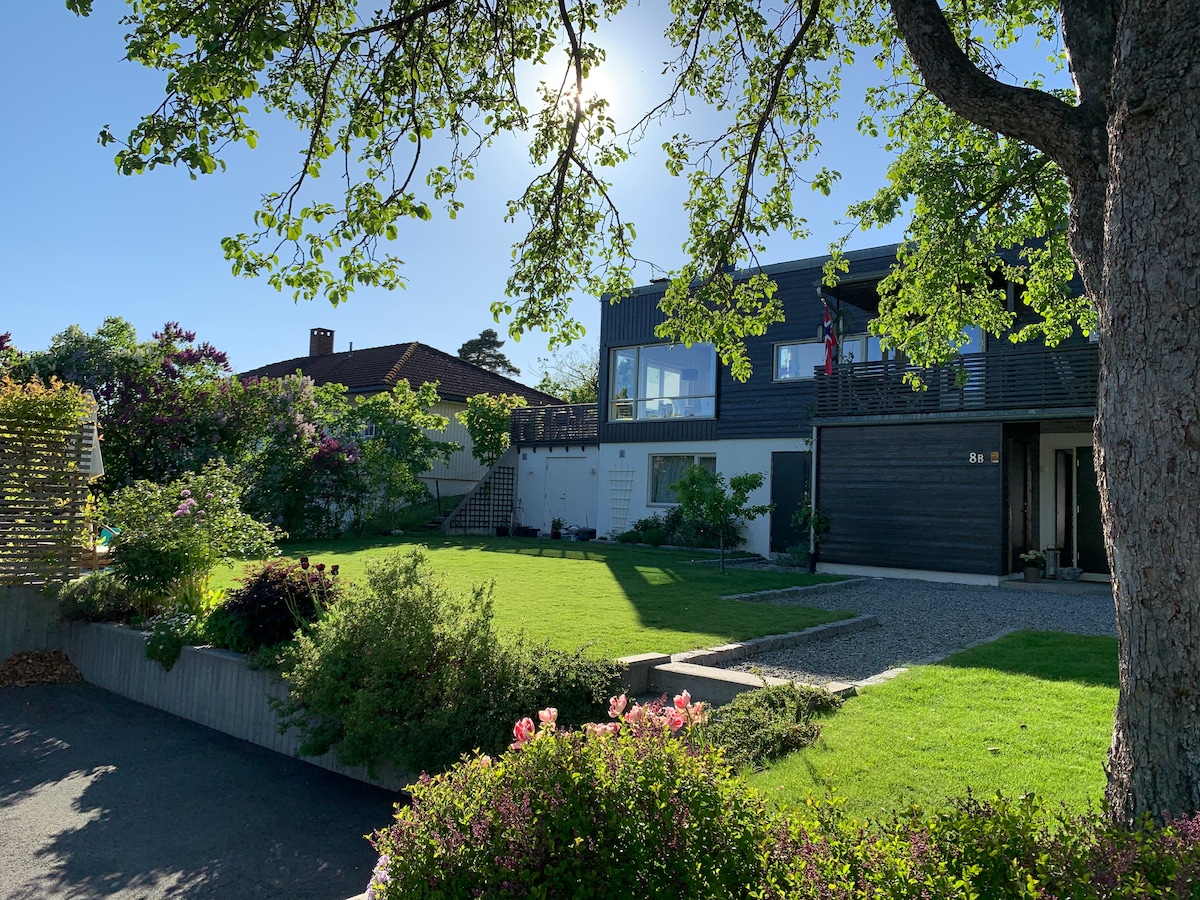 Light and nice apartment, 50 m2. Lovely surroundings! Perfect place for hiking and relaxing. Private entrance and private patio outside. Free parking outside the house. One bedroom with double bed and one single bed. 12 min walk to bus stop, 23 min bus ride to Oslo. 4 km to Sandvika, 8 km to Asker. Quiet and peaceful neighborhood. Sea view, a few meters to jetty and beaches. Rent single/double kayak. Bikes, fishing gear and tennis gear available for free.