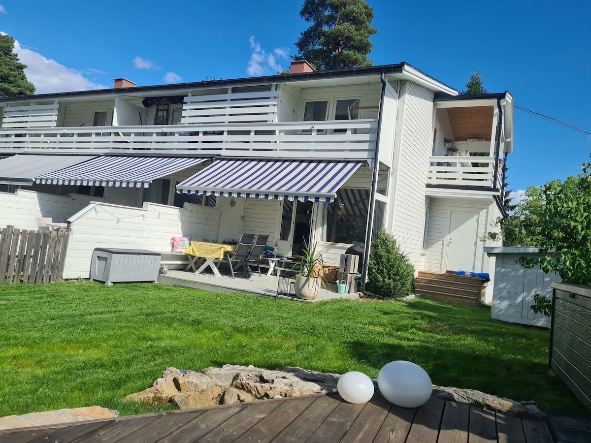 Nice townhouse with a small view overlooking the sea. IT IS NOT A PLACE FOR PARTY!!!. Livingroom at the first floor. Kitchen, bathroom and bedroom at the ground floor. And one more bathroom down stairs . A nice and small garden. It is located In between Lysaker and Skøyen train station. Three minutes walk to the tram that will take you to the city center in 15 minutes. 5 min walk to the bus station taking you to Aker Brygge.