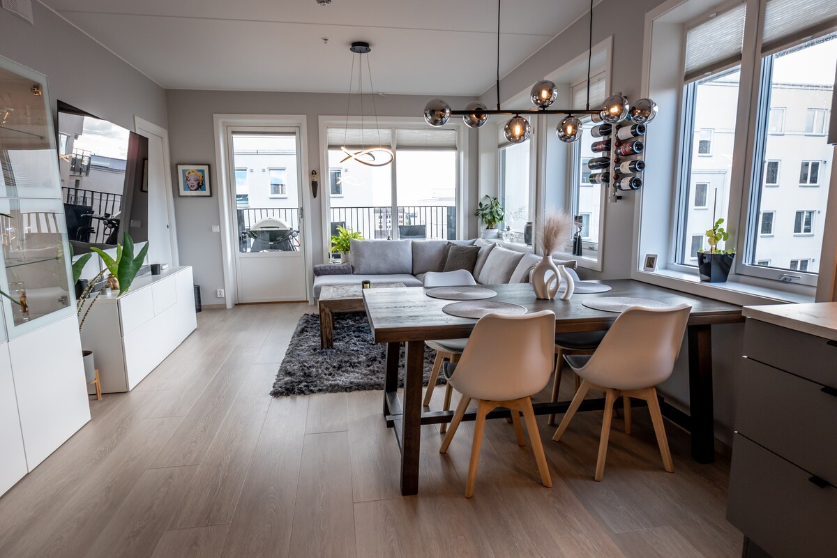 1 triple BR + 1 dbl BR + single/dbl bed* in spacious yet cozy penthouse/loft apt. Floor heating, fireplace, top floor balcony w/hammock & awning, lots of sun & amazing 180° views towards the city centre & the fjord in central, multicultural & Oslo's most vibrant area Grønland! 1 metro stop or 10mins walk to the train station, 7 mins walk to the bus station & 1 city bike incl. Excellent public transport (incl. all metro lines) to all sights. Paid private parking available* Breakfast incl*