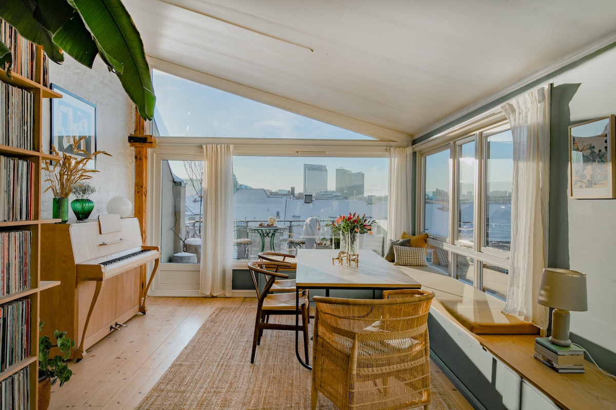 1 triple BR + 1 dbl BR + single/dbl bed* in spacious yet cozy penthouse/loft apt. Floor heating, fireplace, top floor balcony w/hammock & awning, lots of sun & amazing 180° views towards the city centre & the fjord in central, multicultural & Oslo's most vibrant area Grønland! 1 metro stop or 10mins walk to the train station, 7 mins walk to the bus station & 1 city bike incl. Excellent public transport (incl. all metro lines) to all sights. Paid private parking available* Breakfast incl*