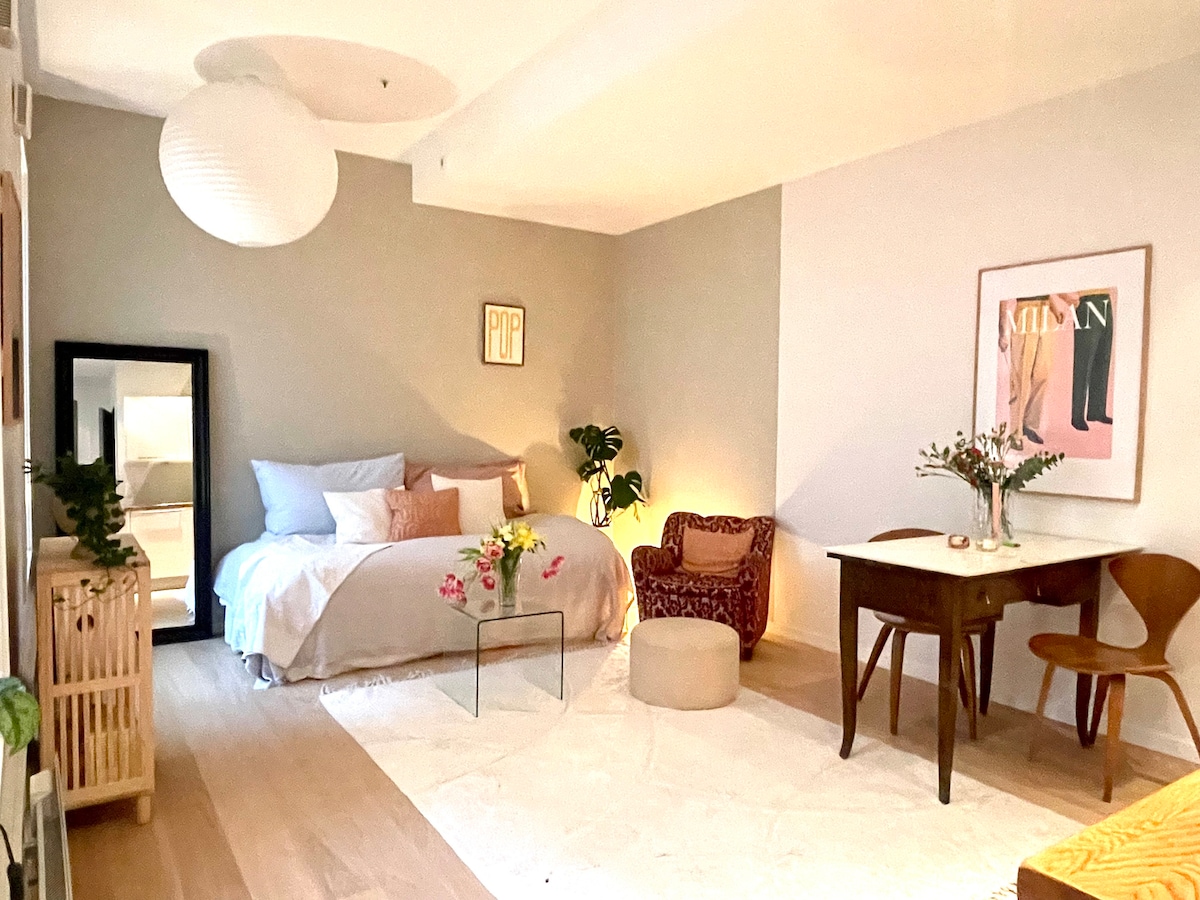 Et stemningsfullt studio med stor balkong – midt i byen, med en varm og rolig atmosfære i mørke farger. Her bor du i et hjem med personlighet, ikke et vanlig hotellrom. Alt ligger innen gangavstand: dagligvarer, restauranter, barer, apotek og grønne parker. Kollektivtransport er lett tilgjengelig, og bylivet er rett rundt hjørnet. Perfekt for deg som vil bo sentralt, komfortabelt og litt annerledes. Unik atmosfære og en lun, hjemmekoselig følelse venter på deg.