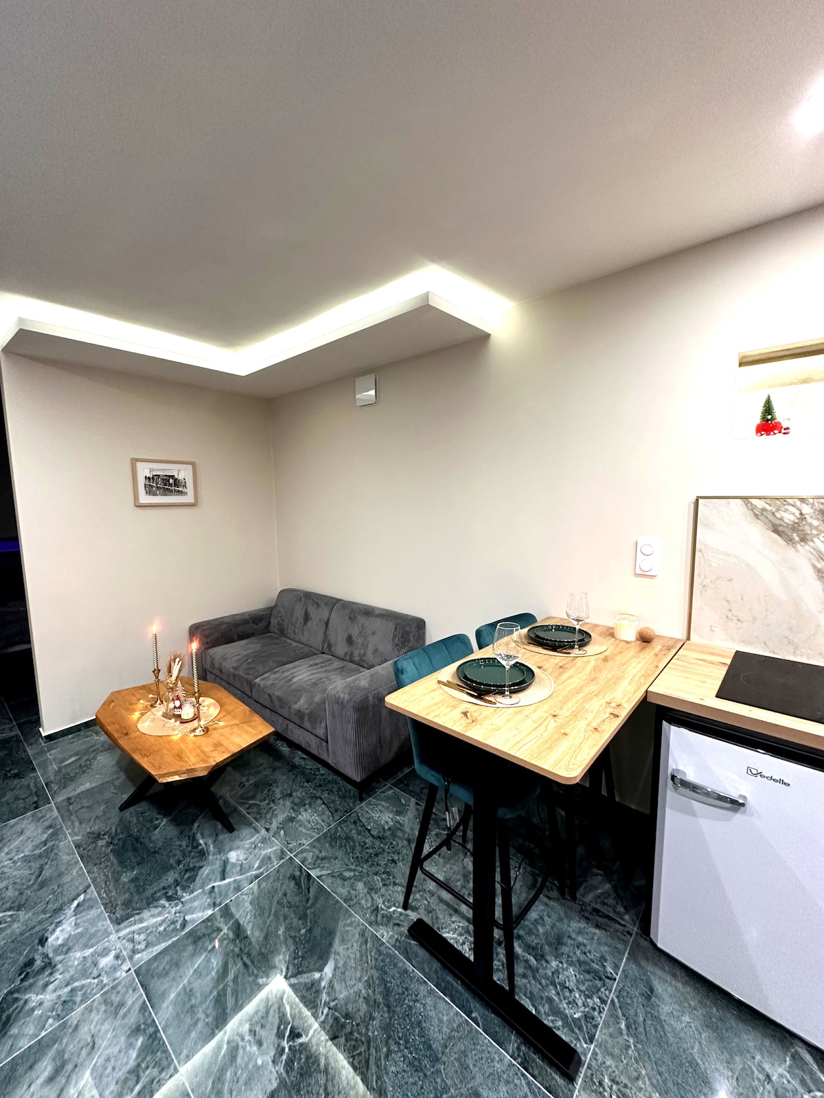 Bienvenue dans cet appartement élégant et minimaliste, idéalement situé au centre ville proche de tous commerces. L'appartement dispose d'une pièce à vivre ouverte, avec un salon cosy et un coin repas moderne. La chambre dispose d'un lit queen-size confortable, et la salle de bain moderne est équipée d'une petite baignoire. Cet appartement est également équipé de tout le nécessaire pour un séjour pratique et agréable : connexion Wi-Fi haut débit, télévision à écran plat.