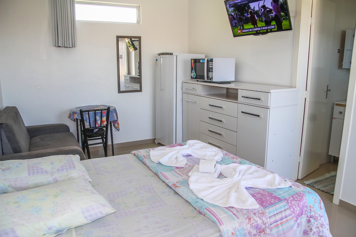 - 100m da praia - Ar-condicionado, TV 32', Geladeira e micro-ondas, cama casal box, sofá-cama - Internet 400mbps - Piscina adulta, infantil e serviço de bar na alta temporada, piscinas térmicas e sauna em área com espaço gourmet todo ano - Sala de jogos com XBOX One X TV 55 4k, sinuca, tênis de mesa, "fla-flu", carteado, dama/xadrez. - Espaço Kids - Área de churrasqueiras - Cozinha comunitária c/ área p/ refeições. - Estacionamento pátio fechado - Banheiro c/ gabinete c/ espelho e box.