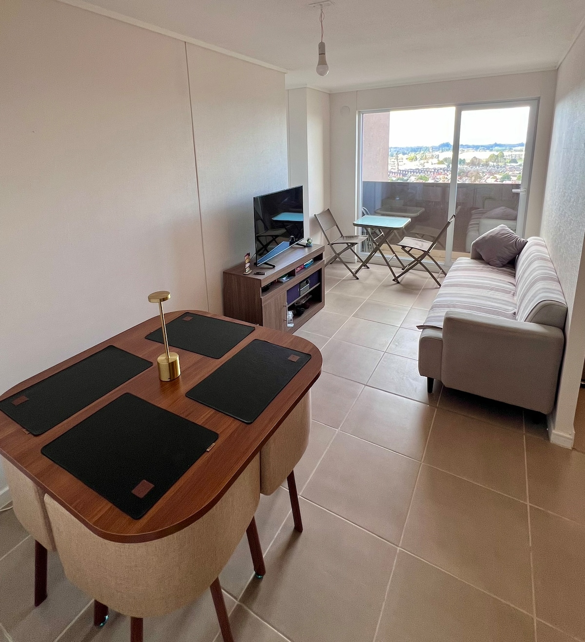 VISITANOS!! Departamento con todas las comodidades requeridas, ubicado en exclusiva zona residencial con una vista envidiable, tranquila y muy segura , con excelente salida a avenida principal, entrada norte carretera, 1 cuadra de supermercado Lider, cerca de Sodimac y negocio a la entrada del edificio, cuenta con estacionamiento privado, ascensor. Totalmente equipado, cuenta con Tv, wifi. Cada vez que un pasajero se retira se realiza servicio de sanitización.