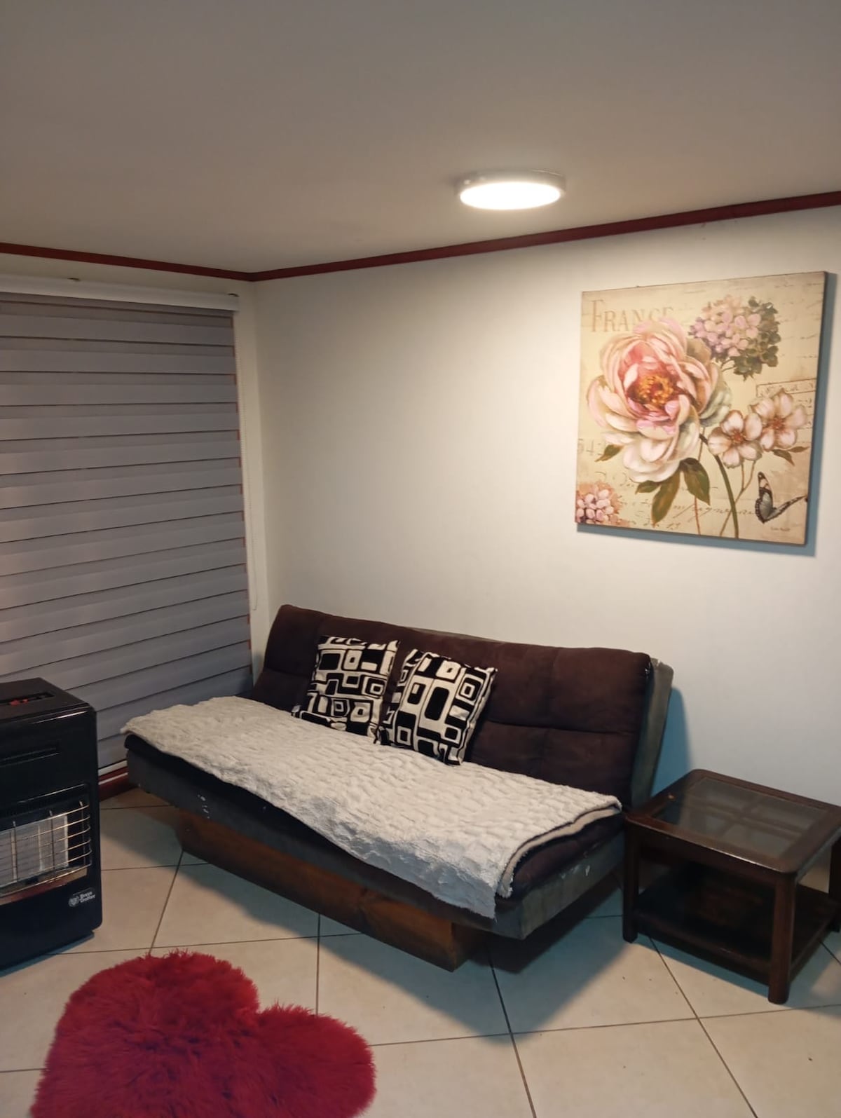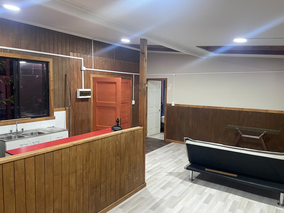 Disfruta de este alojamiento tranquilo y céntrico. Realmente descansaras en el centro de Osorno. Con ambiente cálido, con varios detalles en madera, cocina integrada al living y comedor con 3 sillas, cuenta con una cama en el sector del estar del 1er piso y una cama matrimonial con baño en suite en el 2do piso. Terminal de buses, centro comercial y plaza de armas a 10min, 8min en auto al aeropuerto. No te arrepentirás.