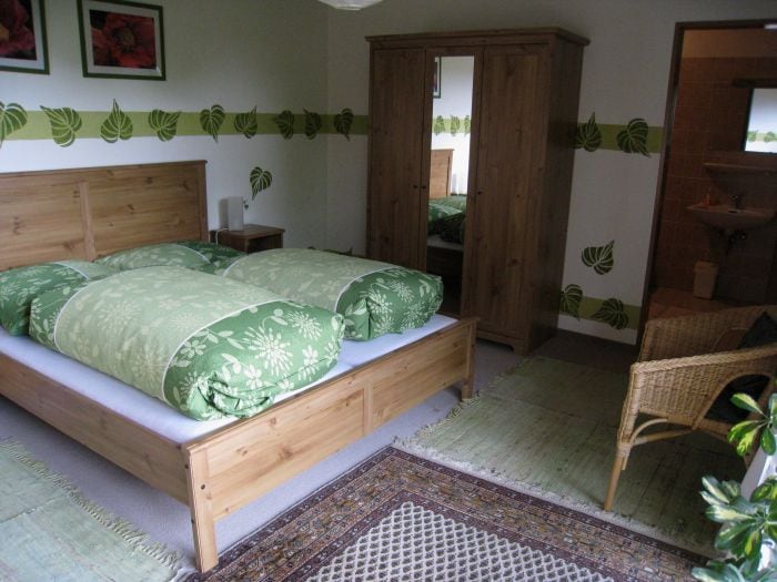 Our great new room with a big terrace offers you a big queen size bed and a sleeping sofa for a third person. Breakfast is included and in summer you can use our pool and our hammocks on the backside of our house. Right outside your room you can find a little kitchen with a water boiler, microwave and fridge. Wifi and cable TV is included.