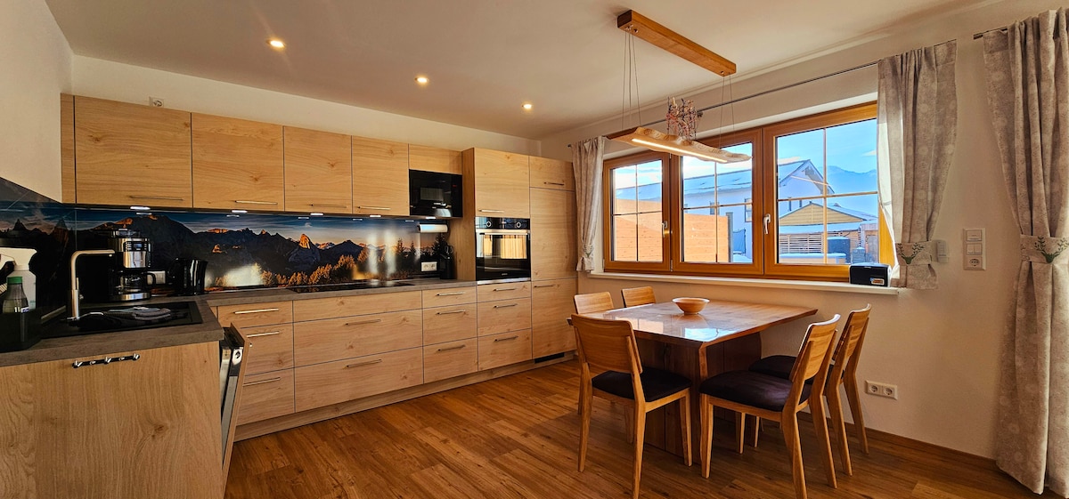 ruhige Lage und atemberaubende Aussicht in die Natur Genießen Sie Ruhe und Freiheit. Lassen Sie sich vom freien Weitblick über die Felder in die umliegende Bergwelt verzaubern. Sie werden entspannen, Kraft tanken und Ihren Urlaub in vollen Zügen genießen. Unsere 50 qm helle, lichtdurchflutete Terrassensuite verfügt über ein King-Size-Doppelbett, einem Schlafsofa, einen Flachbild-TV mit Apple TV, Essbereich und einer voll ausgestatteten, sehr großzügigen Küche.
