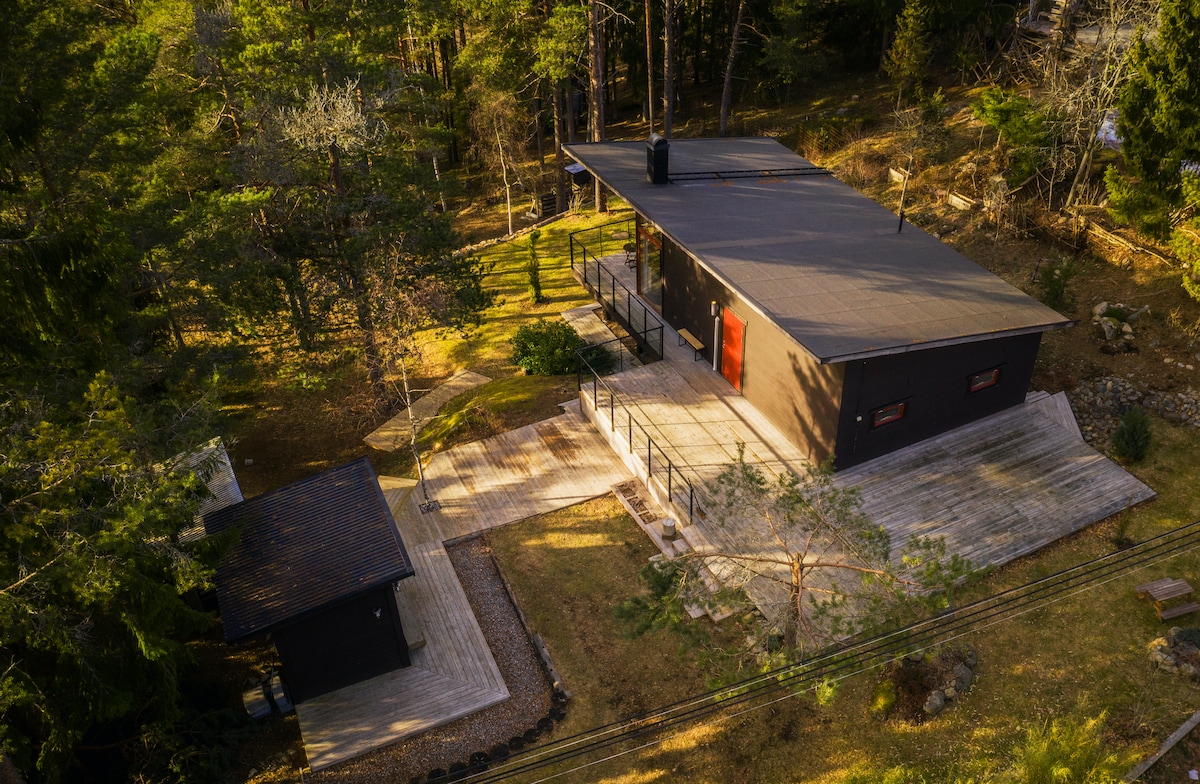 Featured in Airbnb Unique Stays - Three Cabins That Break the Mold Modern house with huge windows and balcony around the house. Great garden towards the forest. It feels like your in a treehouse when in the living room. - Sauna to rent in the garden. - 450 meters to the lake. - Climbing wall, trampoline and slackline in the backyard. - Great internet connection. Two bedrooms and a huge kitchen/living room with a fireplace. Perfect for 4-5 guests or a family who likes to cook, play and swim.