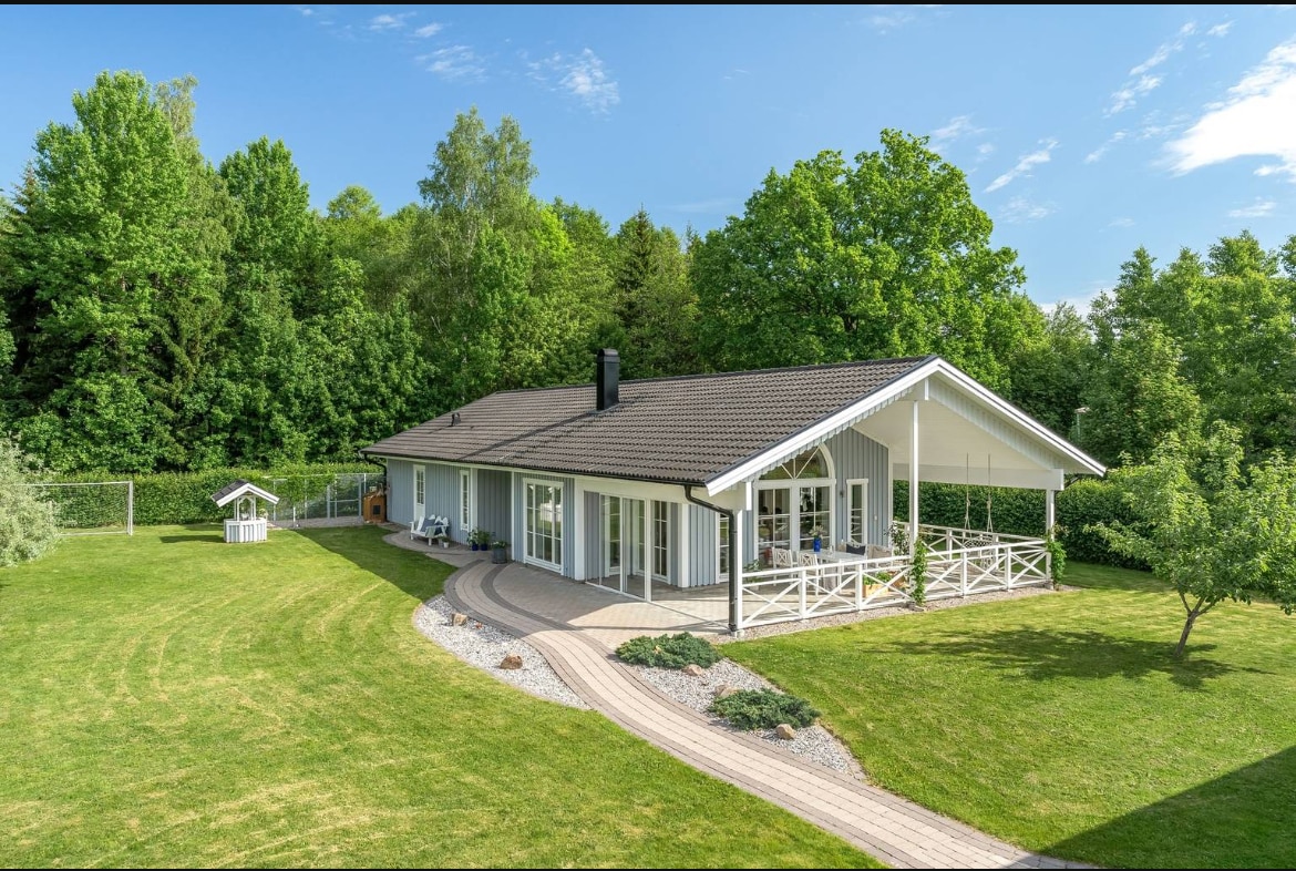 Klassisk stuga vid skogssjö i den östgötska myllan