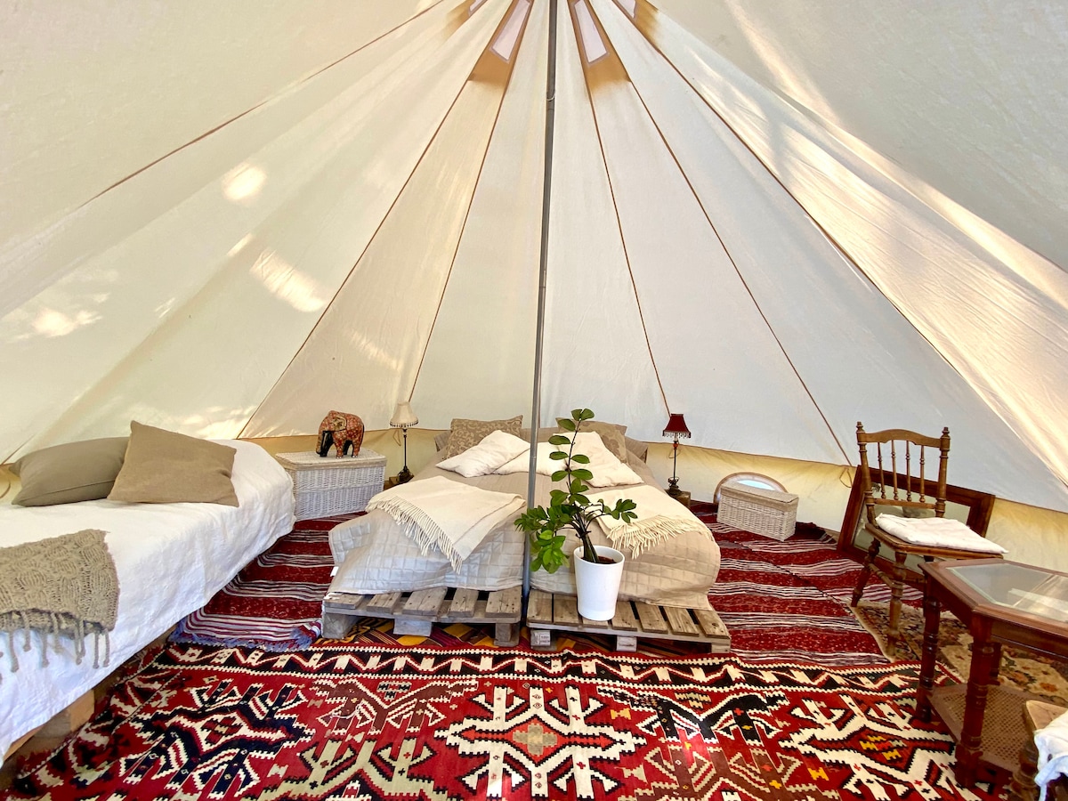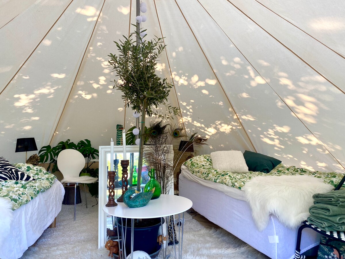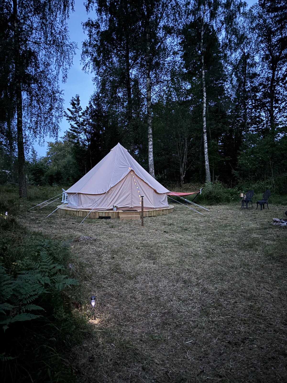Njut av den härliga miljön på detta romantiska boende i naturen. Bo i ett lyxigt tält med nybäddade sängar och vakna upp utvilad till naturens fågelsång! Tältet hyrs ut per natt inklusive frukost. Du kan bo 1-5 st Tältet är utrustat 5 personer. En dubbelsäng är alltid bäddad. Här kan man sova 1-3 personer. En bäddsoffa kan med ett enkelt grepp dras ut till 2 sovplatser. Dessutom finns en luftmadrass att blåsa upp vid behov. Du sopar och diskar efter dig. Lakan, handdukar och slutstäd ingår.