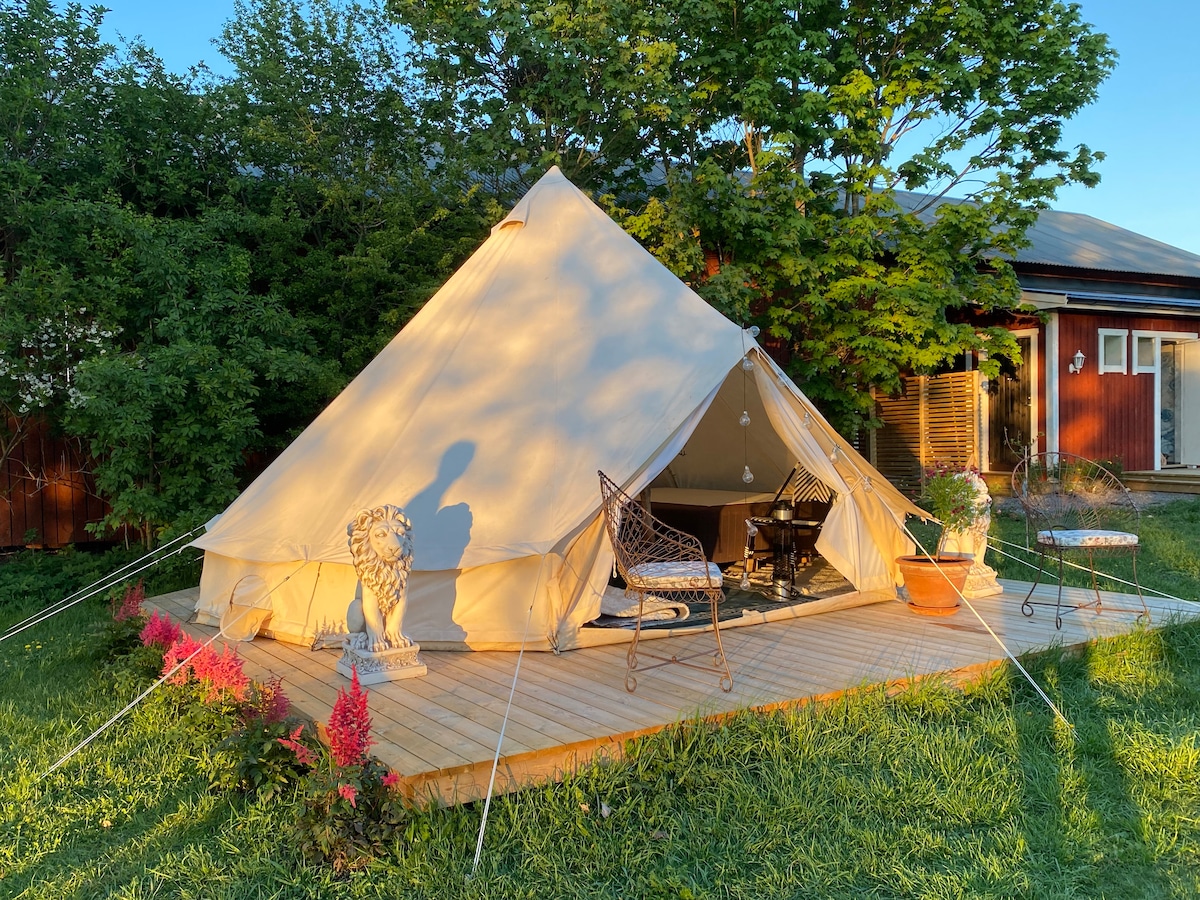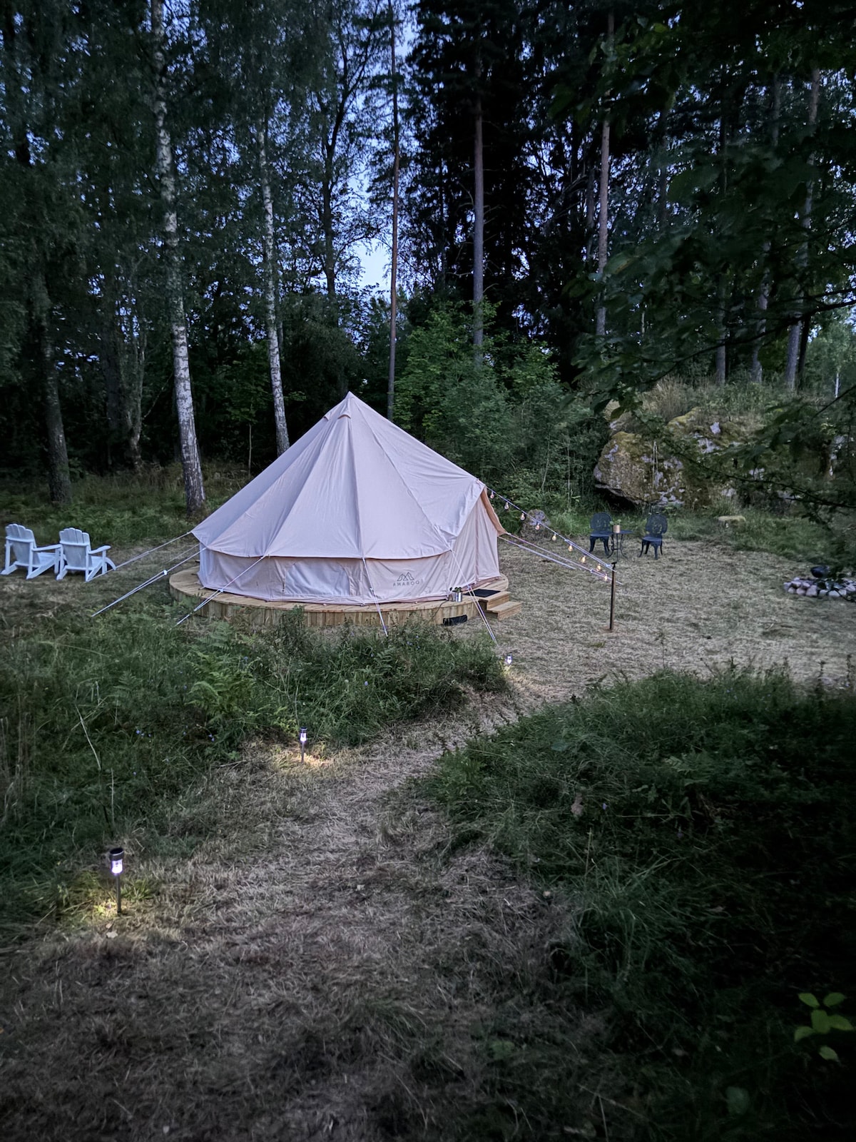 Njut av den härliga miljön på detta romantiska boende i naturen. Bo i ett lyxigt tält med nybäddade sängar och vakna upp utvilad till naturens fågelsång! Tältet hyrs ut per natt inklusive frukost. Du kan bo 1-5 st Tältet är utrustat 5 personer. En dubbelsäng är alltid bäddad. Här kan man sova 1-3 personer. En bäddsoffa kan med ett enkelt grepp dras ut till 2 sovplatser. Dessutom finns en luftmadrass att blåsa upp vid behov. Du sopar och diskar efter dig. Lakan, handdukar och slutstäd ingår.