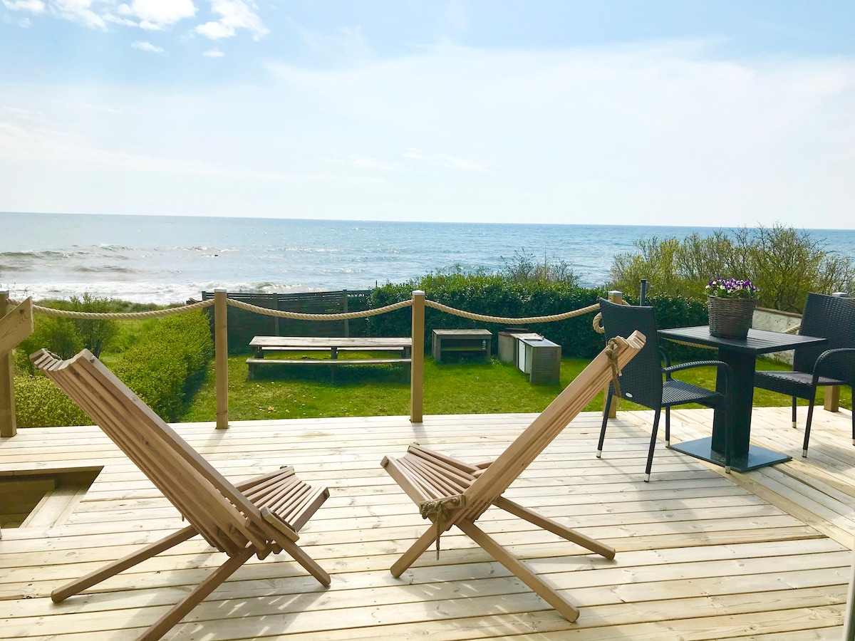 Panoramavy över Östersjön, 15 meter till badstrand med brygga och strandcafé. Somna och vakna till vågornas brus. Två sängar där du ligger på första parkett och ser ut över havet. Pentry med två kokplattor, microugn, kaffebryggare, kyl och frysskåp. Liten matplats, två fåtöljer, TV, Wi-Fi. Badrum med dusch o wc. Stor terrass, gasolgrill. Huset ligger mitt i kustbyn Svarte, ca 6 km till Ystad dit du lätt kör med bil eller cyklar längs havet. Busshållplats och tågstation med goda kommunikationer.