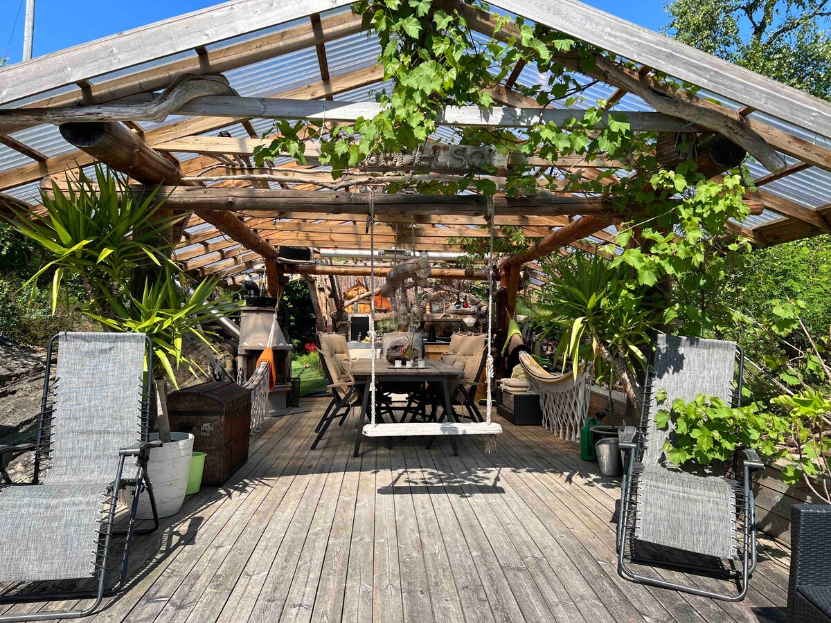Et sted du finner ro og kan nyte dagene dine uten bekymringer, her kan du/dere bade sole grille og kose dere i fred og ro, stedet ligger skjermet og uten innsyn. Om de skulle regne kan du/dere fortsatt sitte tørt under tak og samtidig være utendørs. Dette er en liten enkel hytte med store utendørs muligheter. Hytten er omringet av vann og en elv som går ned til sjøen. Der ligger også nærbutikken og et hotell samt en liten bensinstasjon. Du kan bruke båt ned elven for å handle, eller gå 5min.