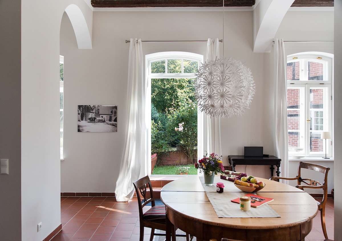 Unser schönes Beamtenhaus ist der ehemalige Wohnsitz des Herzogs von Oldenburg und liegt im hinteren Teil auf unserem Gut, mitten im Grünen mit Blick auf Felder und Wiesen. Die Räume sind großzügig und geschmackvoll gestaltet und selbst mit vielen Personen findet man immer einen eigenen Rückzugsort zum Durchatmen. Ein riesiger, eigenen Garten mit Terrasse und Gartenmöbeln wartet auf Euch, angrenzend daran liegt unsere Pferdeweide.