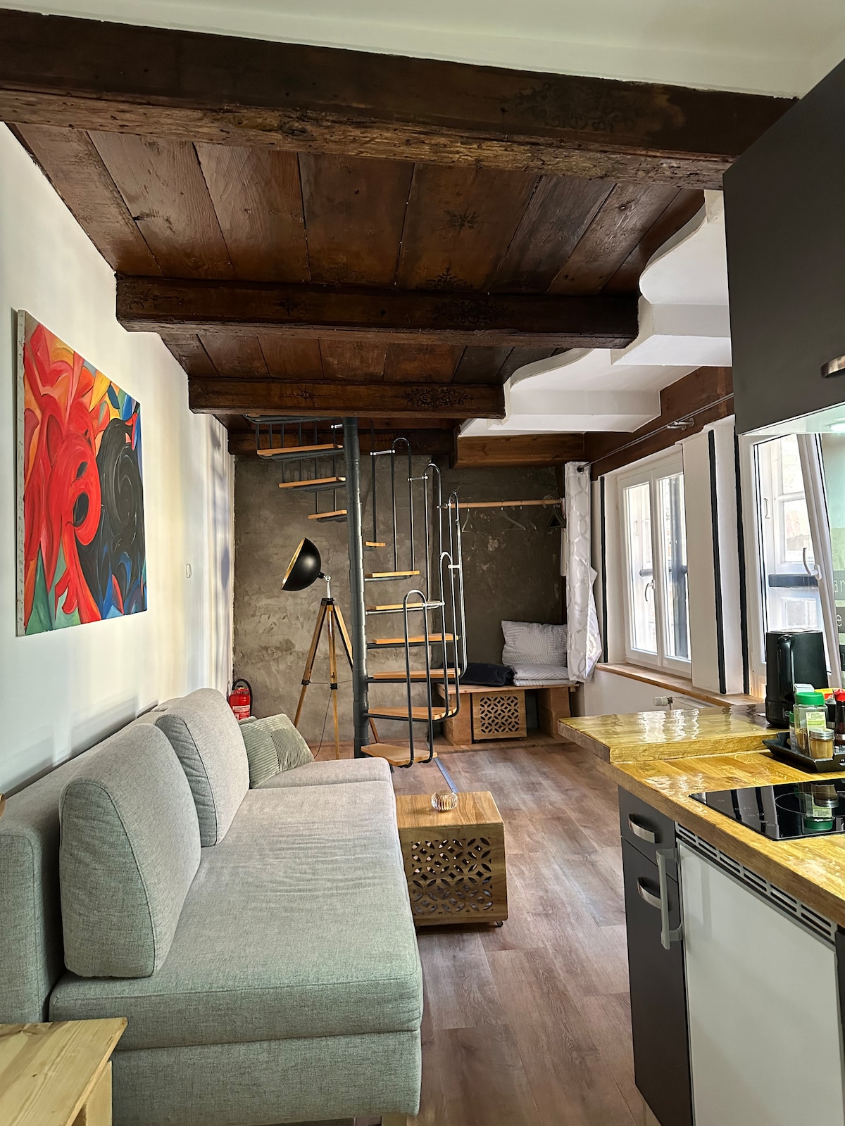 Das Gästezimmer liegt im hinteren Seitenflügel des Altstadthauses in einer ruhigen Gasse. Im unteren Bereich des offenen Studios lädt ein (Schlaf-)Sofa zum Verweilen ein, eine Küchenzeile bietet Raum zum Genießen kleiner Mahlzeiten. Eine schmale Wendeltreppe führt in den Schlafbereich unterm Dach, in dem ein kuscheliges Doppelbett zur Verfügung steht, direkt dahinter gelangt man in das kleine, moderne Bad. Eine gemütliche Alkove über dem Bad bietet eine weitere Schlafmöglichkeit für Sportliche.