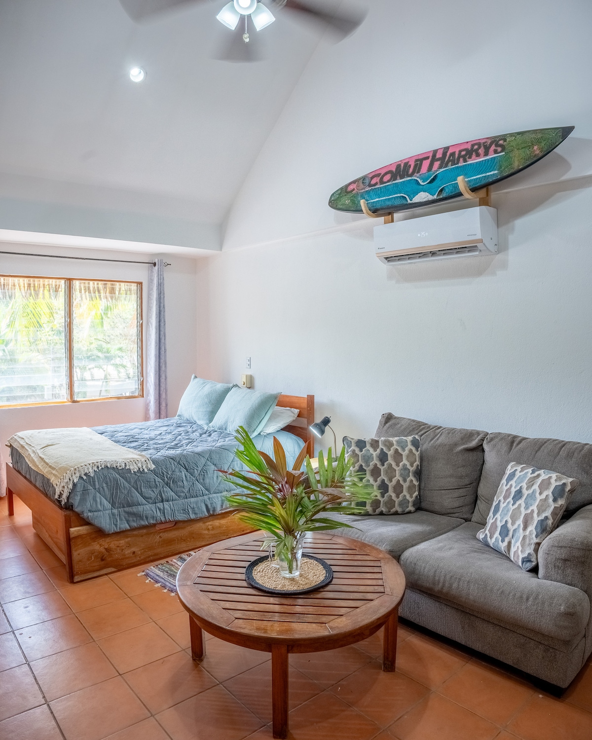 Enjoy easy access to everything from this perfectly located studio apartment is a fantastic home base for your trip to Nosara. Located above the Coconut Harry's surf shop and next door to Organico Grocer and Bakery, you are a 10-minute walk to the Main Guiones surf break. Within steps, you can reach the beach, restaurants, groceries, and a bank. There is also an Organic Market just down the road every Tuesday!
