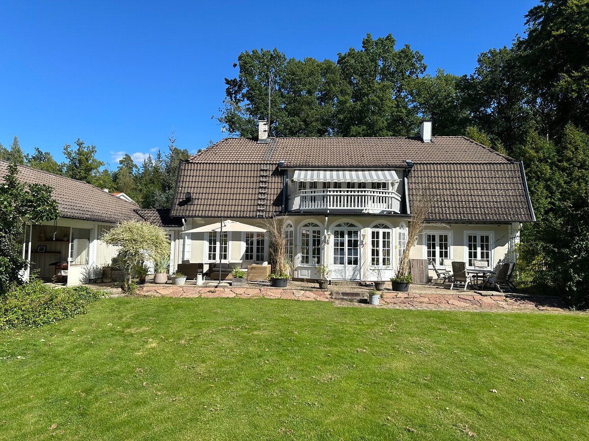 We look forward to welcoming you to Villa Gerastorp! The private country house is located just by a lake and with beautiful surroundings just by the forest. 5 large bedrooms and well sized social areas spread over 2 floors and 2 cousy guest houses just by the main house. Spacious outside porch including a generous lounge and sun chairs. Enjoy a swim in the lake from your private jetty or why not try the wooden burned outdoor sauna and the traditional nordic hot tub!