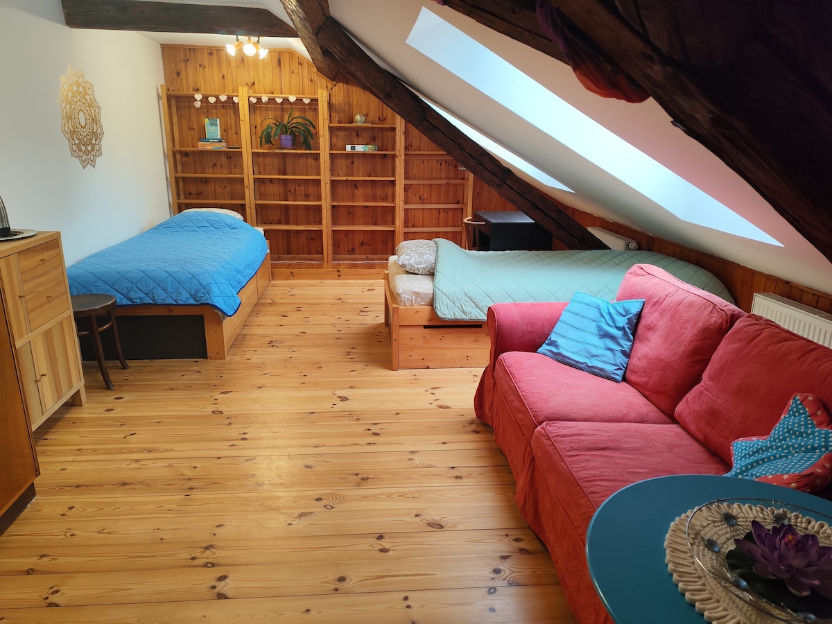 Pohodlný, stylově zařízený, klimatizovaný, tichý podkrovní apartmán pro maximálně 5 osob - možnost přistýlky na skládacím lůžku. Postýlku připravíme na vyžádání předem. Během festivalu BFL/COO akceptujeme pouze 4. denní rezervace s více než 5 pozitivními hodnoceními hosta. Ubytování nabízí klid a soukromí, přední část zahrady s posezením, pergola s grilem, úschova kol, piknikové vybavení do blízkého parku u řeky ... Bezpečné parkování za el. branou. 24 h Check In - KeyBox.