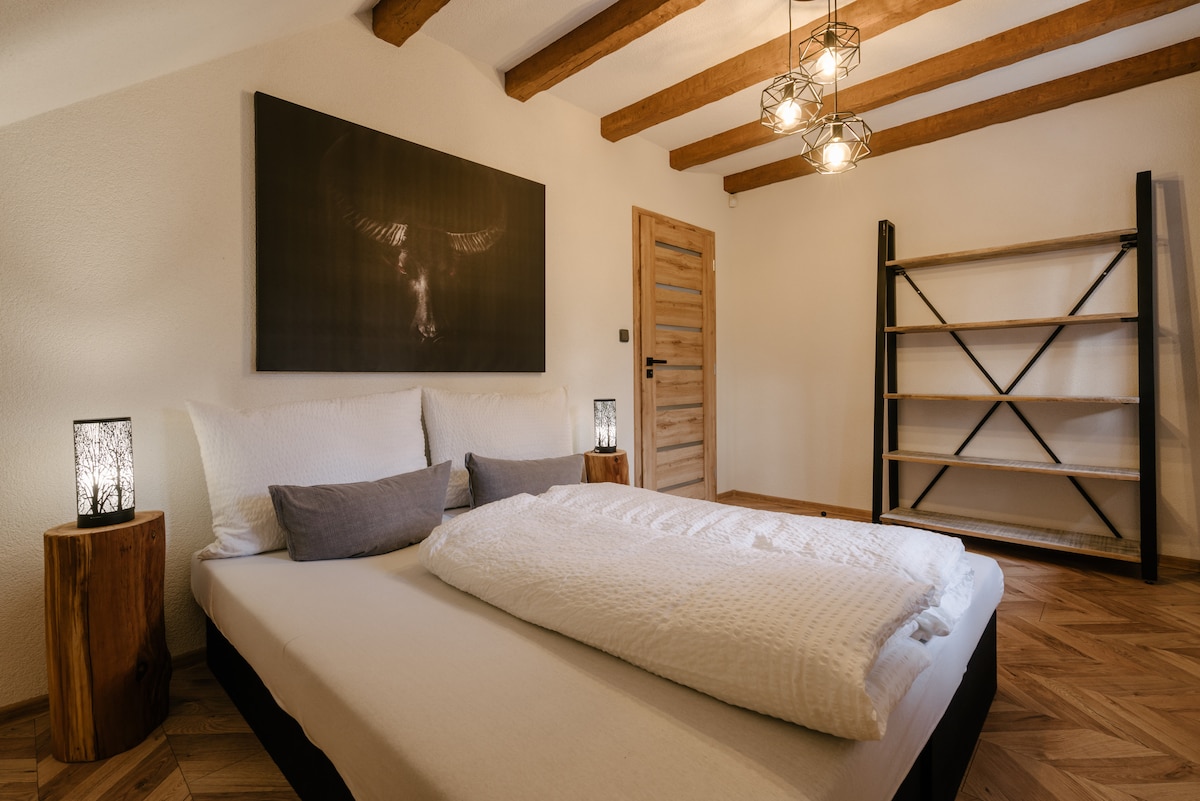 Jedná se o nadstandardně řešený apartmán s terasou a wellness. Vše jako součást nově zrekonstruované původní chalupy v útulném místě polosamoty Beskyd. Pokud jste náročnými klienty a oceníte se svým partnerem nebo rodinou kvalitní architekturu a design, jste u nás správně. Industriální loftový prostor s manželskou visutou postelí v patře, vlastní kamna, soukromá terasa a plně vybavená kuchyň. Dopřejte si u nás odpočinku a zapomeňte na všechen ten shon v naší finské sauně či vířivce. Těšíme se!