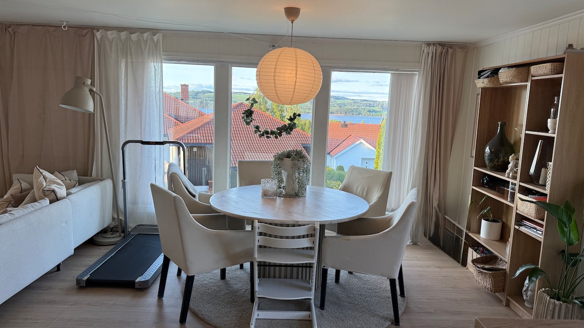 Her kan du nyte rolige dager langs strandkanten, på takterrassen, på golfbanen eller spasere inn til byen om du vil. Unik utsikt over Mjøsa med utgang til terrassen fra soverommet og stuen/kjøkkenet. 1 hovedsoverom med 180 dobbeltseng og 2 vanlige soverom. Det er også mulig med madrass på gulvet på soverommene. 2 fulle bad, det ene med badekar. Vaskemaskin. 100 meter til strandkanten. En dyne og pute til hver gjest. Sengetøy og håndklær medbringes eller leies for en liten sum under oppholdet.