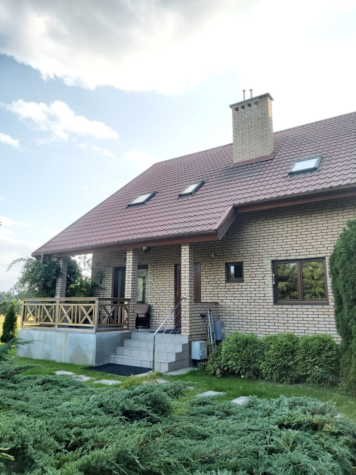 A two-story house with a terrace, garden, and stunning views of nature. 4 bedrooms, 3 bathrooms, 2 kitchens, and a spacious living room with a fireplace. All fresh and functionally furnished. The garden features a lawn, forest, a fireplace, a grill, loungers, hammocks, and a swing. The perfect place for a family or friends to escape the hustle and bustle of the city. No neighbors on the immediate border. Forests, lakes, bike trails, and kayaking trails are nearby. No large parties allowed.