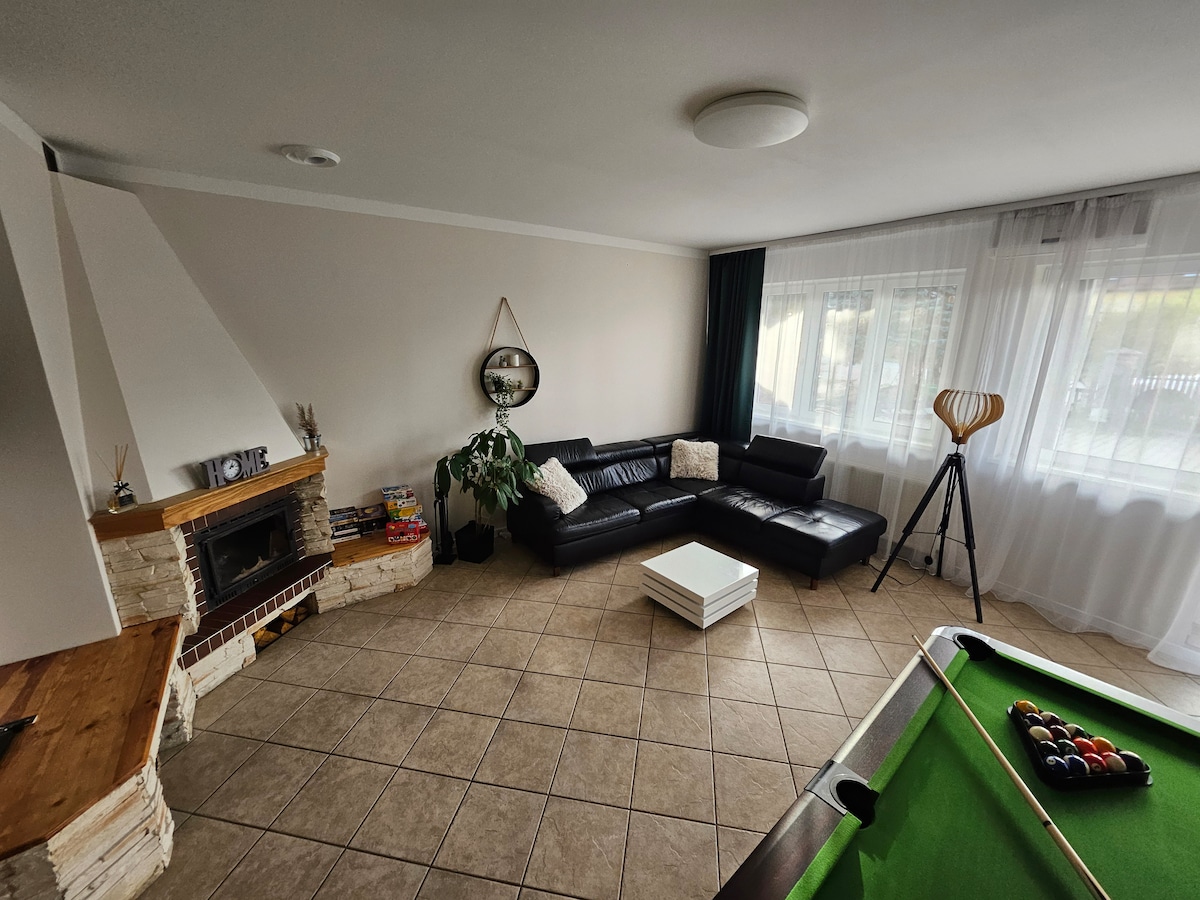Dom pod Świerkiem | Bilard | Kominek | Wanna z hydromasażem Zapraszamy do „Domu pod Świerkiem” – wyjątkowego miejsca w sercu mazurskiego Kajkowa (tuż obok Ostródy). Nasz dom to idealna baza wypadowa dla rodzin i grup przyjaciół (do 6 osób), którzy szukają relaksu w komfortowych warunkach, z dala od zgiełku miasta, ale z dostępem do wszystkich lokalnych atrakcji.