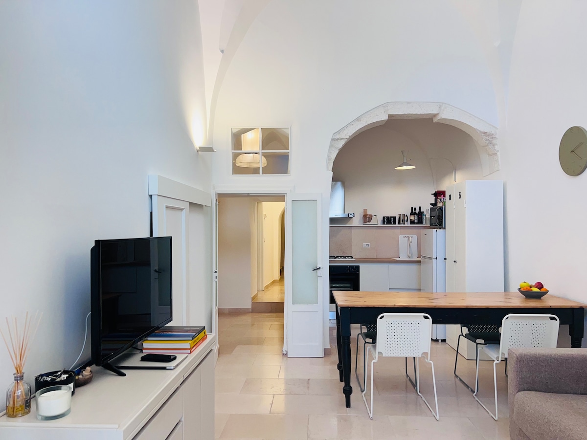 ROMANTIC HOME Characteristic house in a very central position with typical Salento stone vaults furnished with reclaimed furniture combined with other more modern furnishings; it has every comfort (including a nice shower with a large shower head, a kitchen with induction hob, dishwasher, washing machine, fridge and air conditioning); has n. 4 beds. The terrace is the centerpiece: usable for dining, or as a solarium: the view stretches from the rooftops of Ostuni to the cathedral and the sea.
