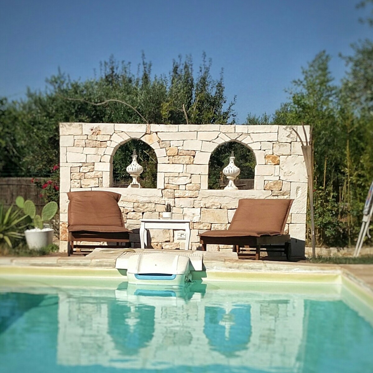 Trulli Namastè is the perfect place to enjoy the charms of the Puglia countryside, a natural paradise in a quiet, seculed and enchanting place surrounded by olive trees. The ideal place for a couple (with or without children) who want maximum privacy considering that the whole structure, trulli, swimming pool and garden, would be at your complete disposal in an exclusive way. The ideal place for your honeymoon or to organize your wedding proposal or simply to live a special couple's holiday.