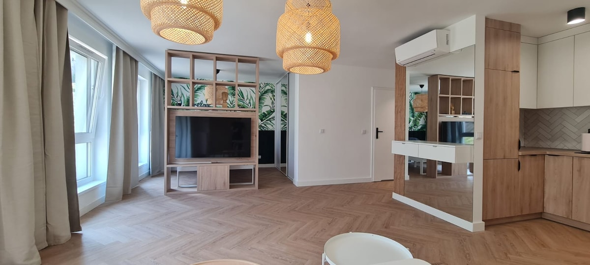 Apartament o eleganckim i stylowym wystroju, który składa się z jednej sypialni, salonu, kuchni i łazienki. Salon jest przestronny i wyposażony w telewizor płaski, który umożliwia oglądanie ulubionych programów w wysokiej jakości. W salonie znajduje się również wygodna kanapa. Sypialnia jest przytulna i wygodna. W sypialni znajduje się duże łóżko, które zapewnia wysoki komfort snu. Kuchnia jest w pełni wyposażona we wszystkie niezbędne rzeczy. Łazienka jest elegancka i funkcjonalna.