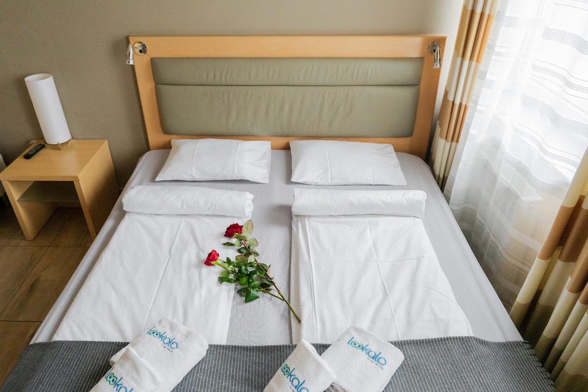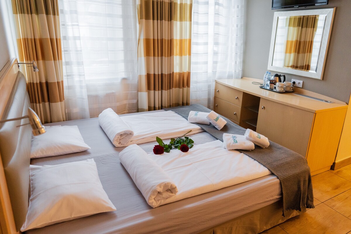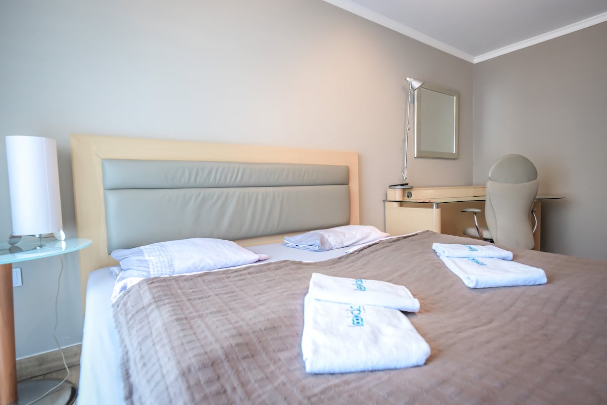 Granatowy Apartament(34m²)–nowoczesny styl i pełen komfort! Jasne wnętrza z klimatyzacją, roletami zewnętrznymi i moskitierami zapewniają idealne warunki do wypoczynku. Apartament oferuje łóżko 160x200 oraz rozkładaną sofę, w pełni wyposażoną kuchnię (ekspres do kawy, czajnik, lodówka, mikrofalówka) i prywatną łazienkę z prysznicem. W pokoju znajdziesz również żelazko, deskę do prasowania i suszarkę do włosów. W części wspólnej: pralka i suszarka bębnowa. Monitorowany, ogrodzony parking