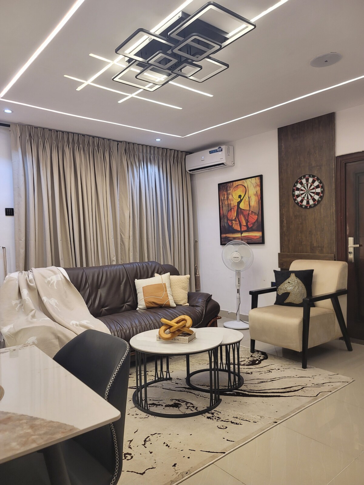 In this home, We’ve passionately created that perfect Indoor/Outdoor experience. It comes complete with a Pool, Gazebo, Laundry area and more. Inside is a living area with 65inch smart Tv and leather settees. Your bedrooms come ensuite with modern bathrooms and high water pressure. The kitchen comes with a heat extractor, and burners. Our WiFi is wired and Super fast. Power is 24/7. At your service is a Security guard and Porter.