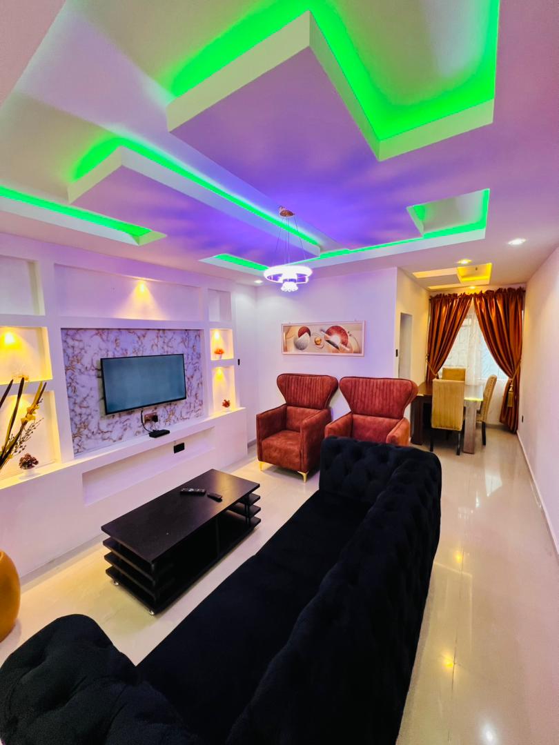 A one bedroom, bathroom and living room apartment with a blend of Afrocentric and modern contemporary wood designs. In house spa- a sauna, steamer and massage rooms-, in house restaurant, gym and coffee lounge, outdoor pool with a poolside Pergola, 24/7 power, security and cctv. It’s ideal for both long and short stays with a minimum of three days located five minutes drive from the international airport and twelve minutes drive from the domestic airport. Airport pickup and dropoffavailable