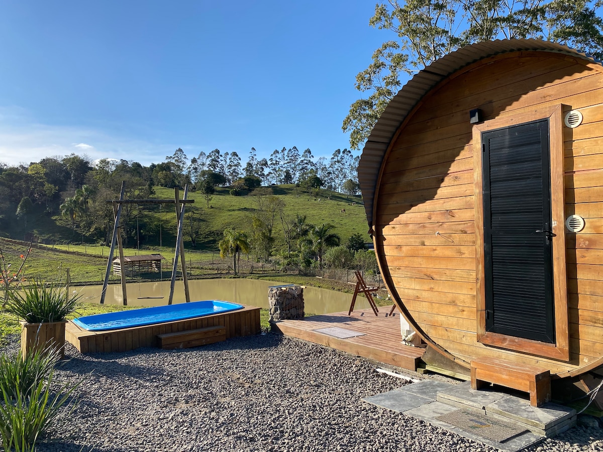A cabana conta com Wi-Fi, TV e uma cozinha completa . Na área externa, a varanda com deck churrasqueira .E vista encantadora. No Sítio D’Maria, você também pode aproveitar para caminhar até o lago, pescar, temos animais como gansos, cisnes e vacas.