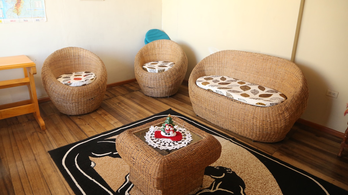 Welcome to Watzara Wasi! We offer family accommodation 2km from Cotacachi, perfect for families with pets (2 max )and nature lovers. Enjoy views of the Imbabura Volcano. We also offer you the option of monthly stays (30 days). We have office space with 80 MBPS speed Wi-Fi suitable for teleworking. It has a living room, dining room and fully equipped kitchen, including a refrigerator. We are waiting for you, so that you can experience the wonder of Imbabura
