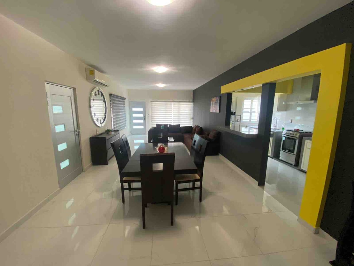 Casa de 4 recámaras, 3.5 baños, cochera cerrada 2 vehículos, ubicada en la mejor zona de la ciudad; fácil acceso a principales vialidades. Aire acondicionado, roku tv y ventilador en cada recámara; cocina equipada; lavandería con lavadora y secadora; internet de fibra óptica 100 megas; sala con sofá cama, escritorio, ventilador y smart tv; comedor y baños con ventiladores; patio trasero con asador; cerradura de clave; otras amenidades. Sala no tiene AA, solo dormitorios. Se factura