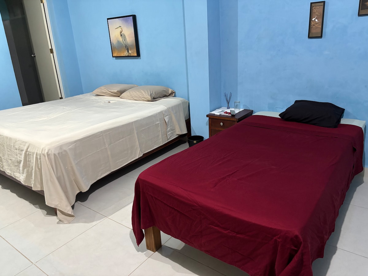 Cuarto independiente con A/C, a 10 minutos del aeropuerto y a 4 minutos de la terminal de autobuses, cerca de centro comercial, cuenta con una cama King Size y una Hamaca, baño completo con agua caliente , televisión smart con aplicacion netflix y youtube, wifi las 24 horas, closet, ventilador y área para trabajar. Tiene parque enfrente donde hacen actividades de zumba y cardio, gimnasio cerca y tienda Oxxo así como farmacias y negocios de comida rapida.