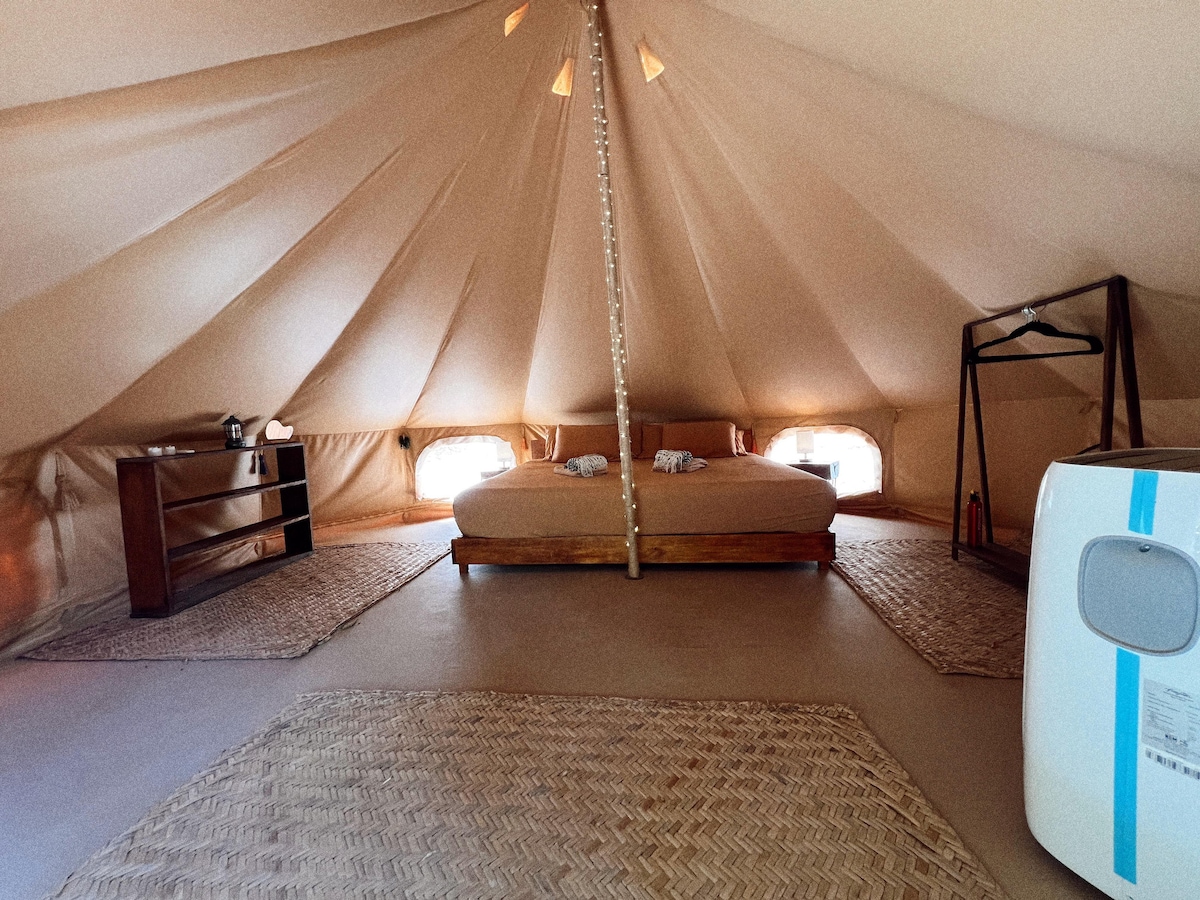 Découvrez notre nouvelle tente Queen Size, un espace cosy et confortable niché au cœur de la nature. Idéale pour deux personnes, elle est équipée d’un lit queen size avec literie de qualité pour un sommeil réparateur, ainsi que de la climatisation pour un confort optimal, même lors des journées chaudes.
