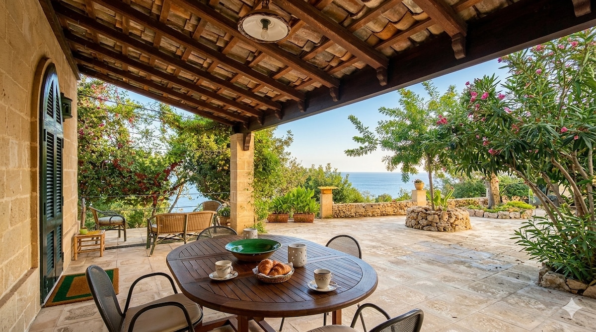 Villa in pietra, con un panorama mozzafiato sul mare, caratterizzata da grandi terrazze e una piscina fronte mare dove ammirare la costa salentina; circondata da un grande e curatissimo giardino è collegata con le antiche vie del sale(sentieri usati per il trasporto del sale dal mare all'entroterra)ottime per gli amanti del trekking e per scoprire la macchia mediterranea. L'arredamento interno è nuovo, confortevole e tutte le finestre hanno la vista sul mare e sono dotate di zanzariere, WiFi