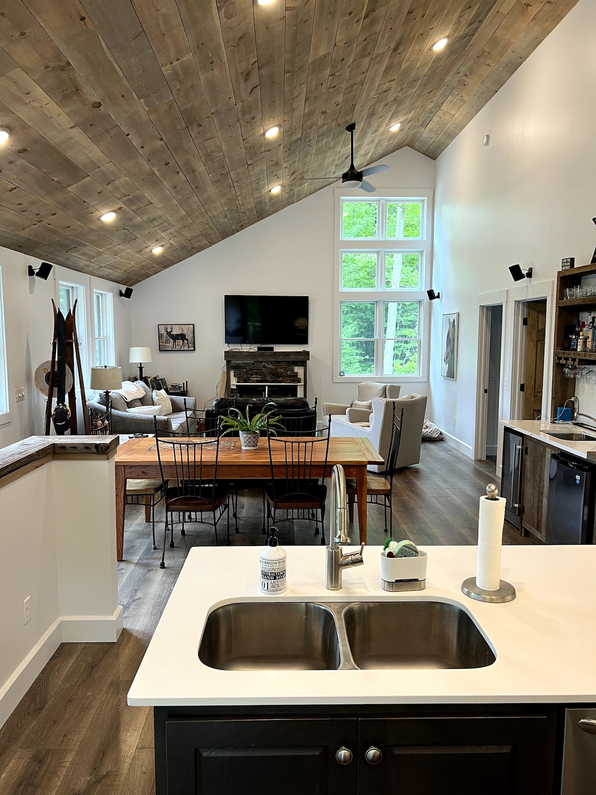 Just minutes from Treetops Ski Resort, with snowmobile trails at the end of the road, our cozy lakefront ranch overlooks peaceful Kassuba Lake and sleeps six. Inside you’ll find a king bedroom, a bunk room with two twin-over-full bunks, a full bath, and a fully stocked kitchen. Large windows fill the space with natural light. After a day of adventure, relax with a 58" Smart TV, HDMI hookup, DVD player, and WiFi - perfect for a four-season Up North getaway.
